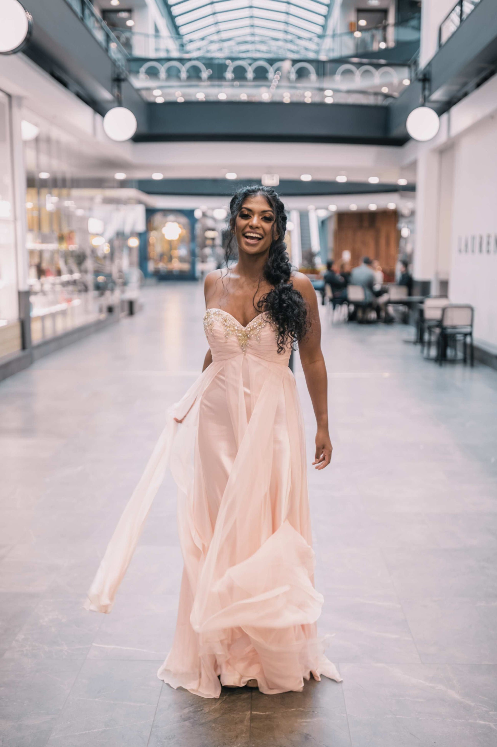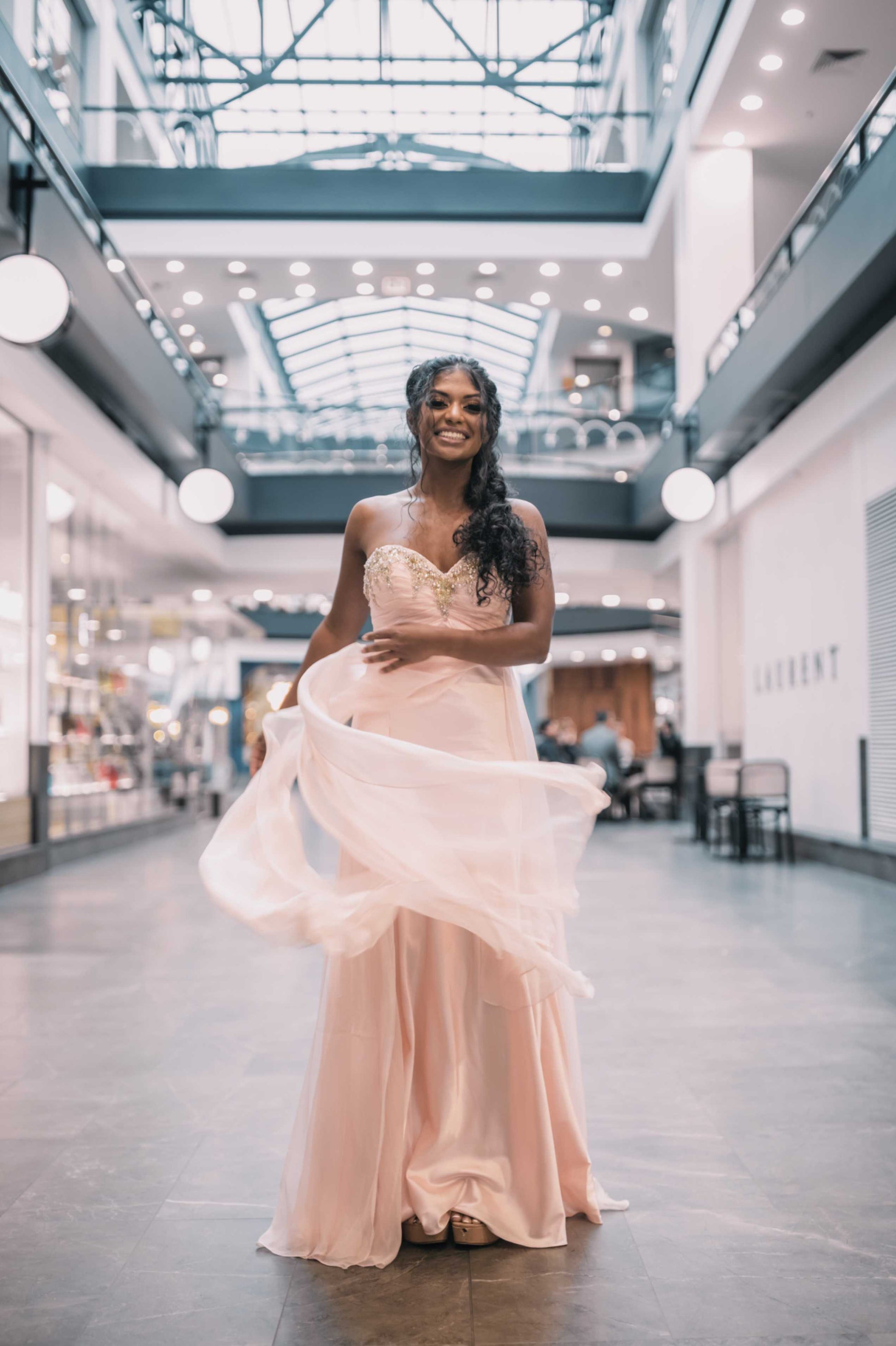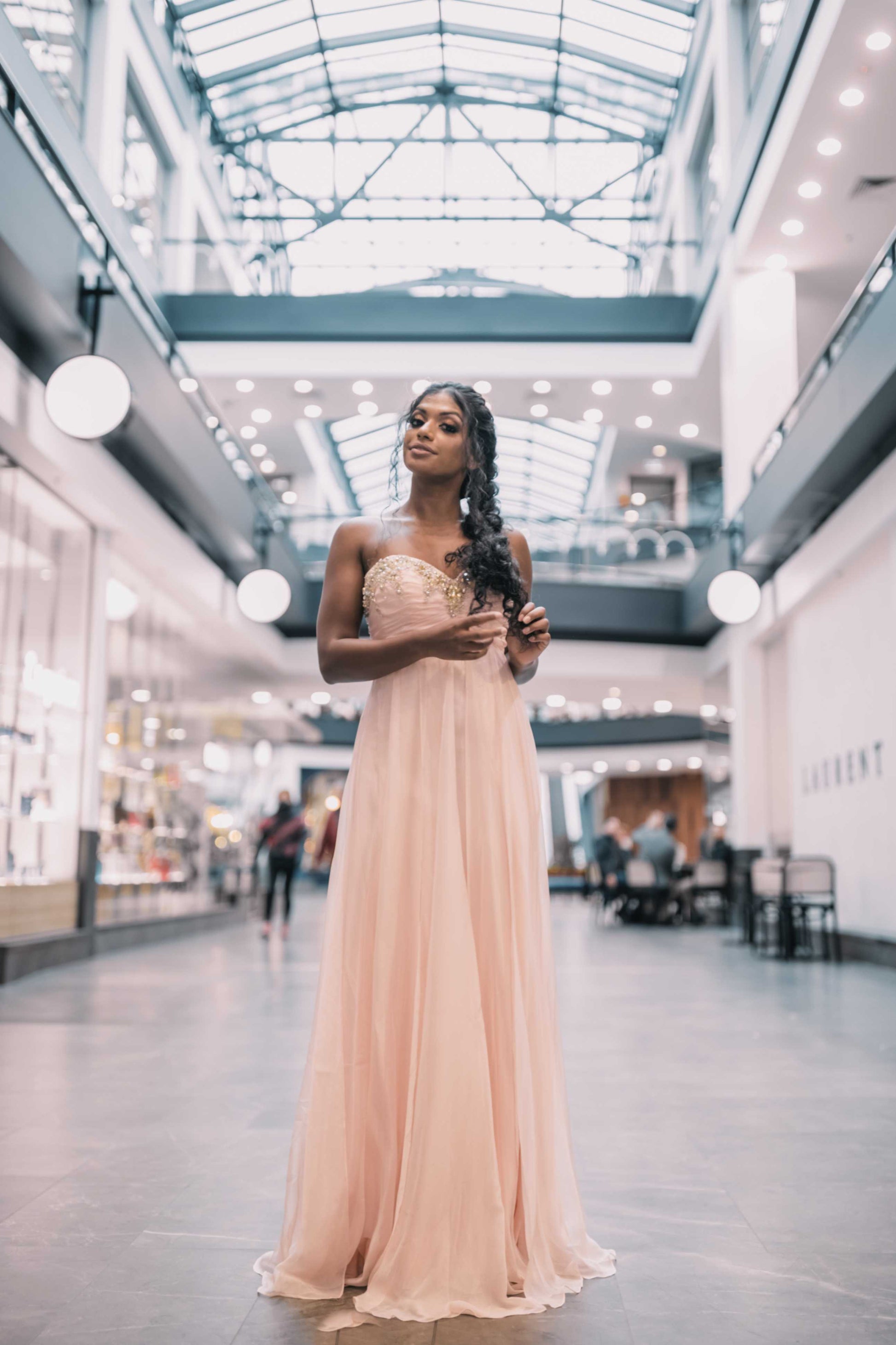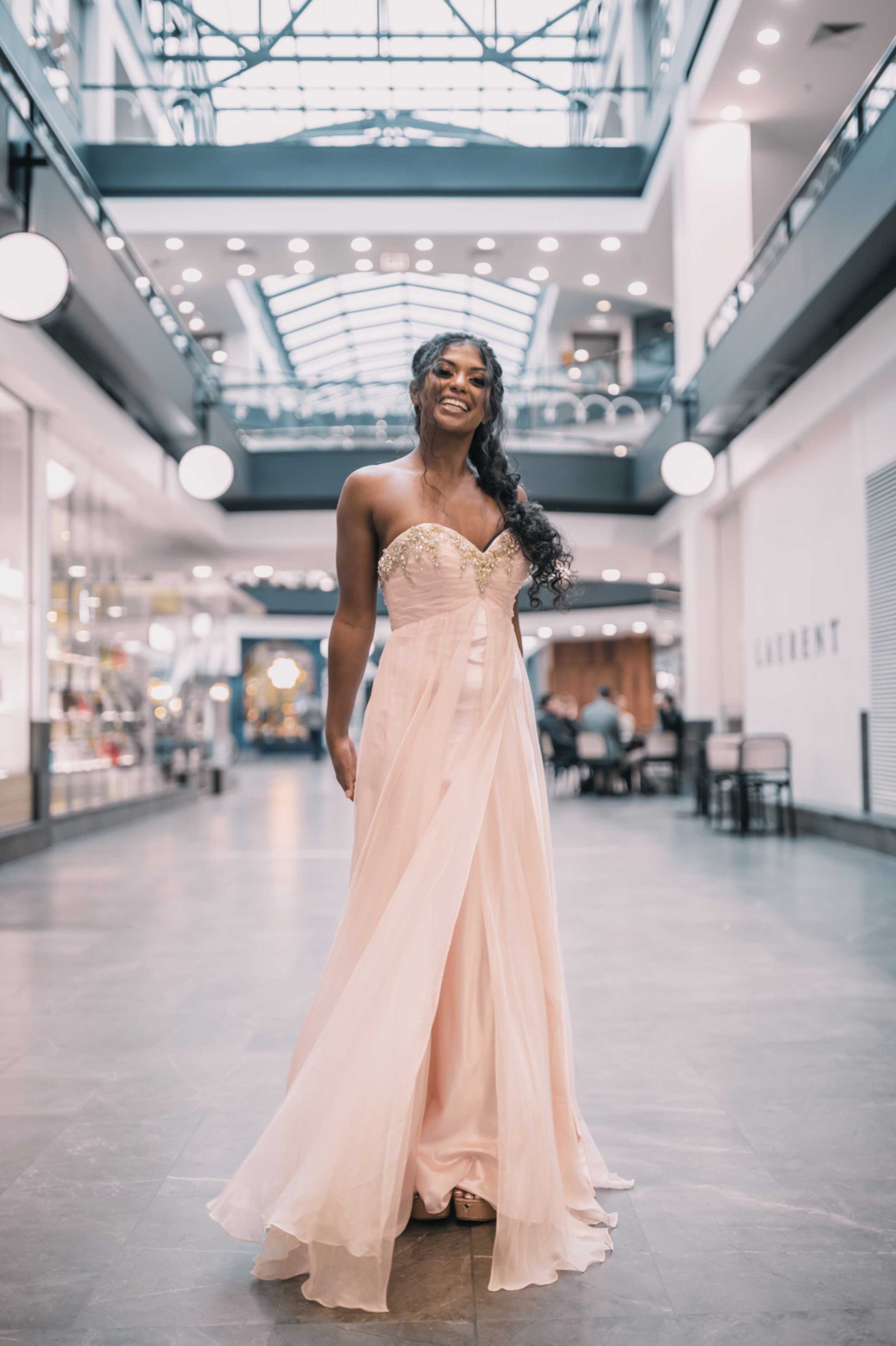 Float through your special event with the ethereal Peach Blossom Flowing Gown. Designed with